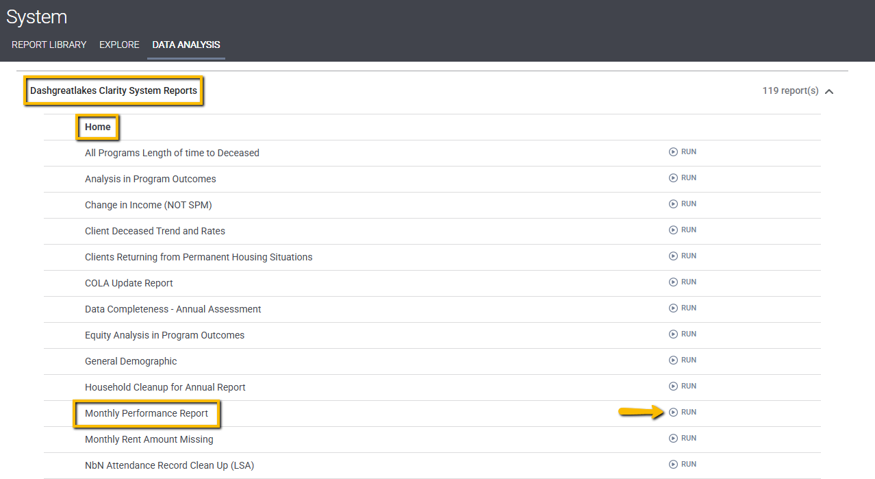 Next, click on Dashgreatlakes Clarity System Reports to expand the section. The report is under the Home heading and is titled Monthly Performance Report. Click "RUN."